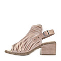 Кожаные женские босоножки бежевого цвета – это комфортная повседневная обувь, которая визуально удлинит ноги, подчеркнет их красоту. Модель выглядит очень лаконично, у нее сдержанный декор – аккуратная перфорация в верхней части, ремешок-застежка в тон. Босоножки оставляют открытыми пятку и пальцы ног, закрывают верхнюю часть ступни. Каблук невысокий, достаточно широкий и устойчивый.