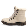 Лаконичные бежевые ботинки с высокой шнуровкой. Верх выполнен из мягкой искусственной кожи нового поколения, устойчивой к истиранию. Голенище декорировано текстильной имитацией меха. Подкладка и стелька обеспечивают комфорт стоп в прохладную погоду. Высокая резиновая подошва с выраженными протекторами отличается устойчивостью на любых покрытиях. Модель удобно застегивается на молнию.