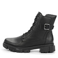 Стильные черные ботинки выполнены из микса натуральной и искусственной кожи для оптимальной защиты стоп от влаги и ветра. Подкладка утеплена искусственным мехом, который эффекттивно удерживает тепло внутри обуви. Высокая резиновая подошва с выраженными протекторами обеспечивает устойчивость на любой поверхности. Модель с высокой шнуровкой и удобной застежкой на молнию.