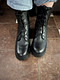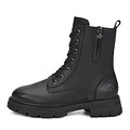 Минималистичные черные ботинки с высокой шнуровкой. Верх выполнен из гладкой кожи, которая надежно защищает ноги от влаги и ветра. Шерстяная подкладка и велюровая стелька обеспечивают комфортную терморегуляцию стоп на улице и в помещении. Утолщенная резиновая подошва с выраженными протекторами отличается прочностью и хорошим сцеплением с любой поверхностью. Модель дополнена удобной застежкой на молнию.